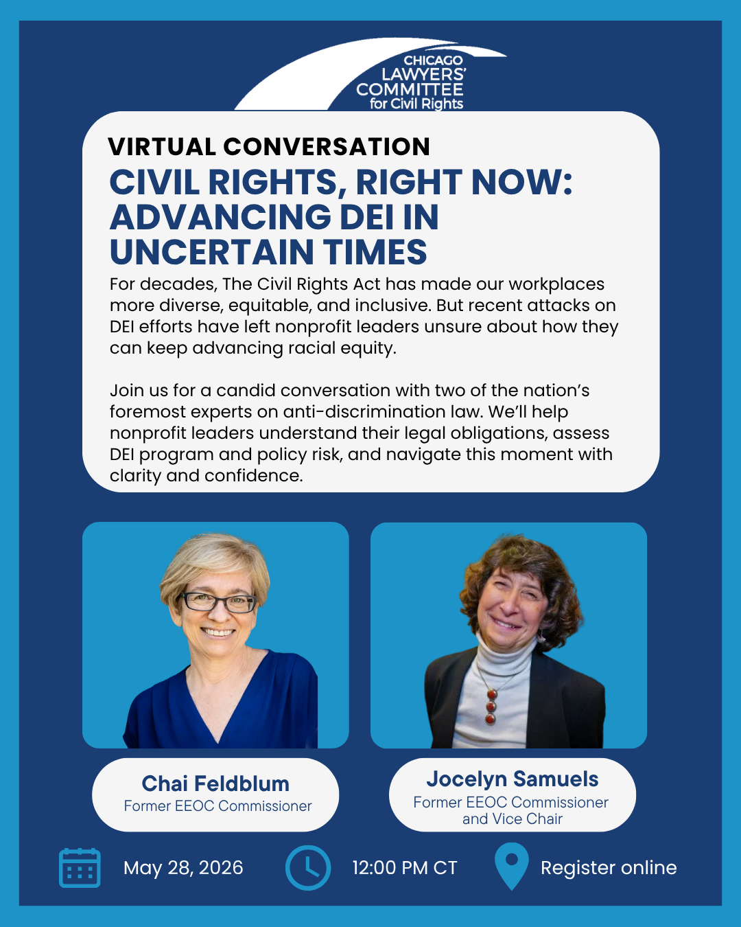 Advancing Diversity, Equity, and Inclusion in Uncertain Times: Insights on EEOC Enforcement from EEO Leaders Thursday, May 28, 2026 12:00 PM 1:00 PM Google Calendar ICS RSVP RSVP