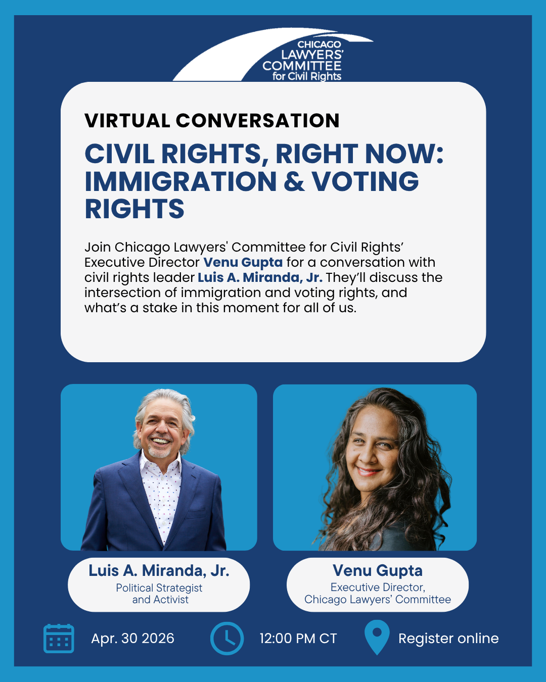 Civil Rights, Right Now: Immigration & Voting Rights Thursday, April 30, 2026 12:00 PM 1:00 PM Google Calendar ICS RSVP
