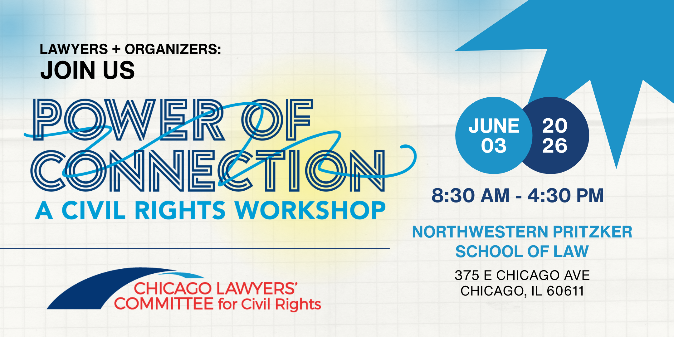 Power of Connection: A Civil Rights Workshop Wednesday, June 3, 2026 8:30 AM 4:30 PM Northwestern Pritzker School of Law 375 East Chicago Avenue Chicago, IL, 60611 United States (map) Google Calendar ICS GET YOUR TICKET HERE